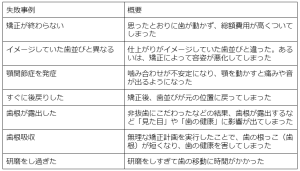 失敗とみなされる歯科矯正とは、具体的にどういったケースを指すのでしょうか。以下の表でまとめた事例について、それぞれ詳しく説明していきます。